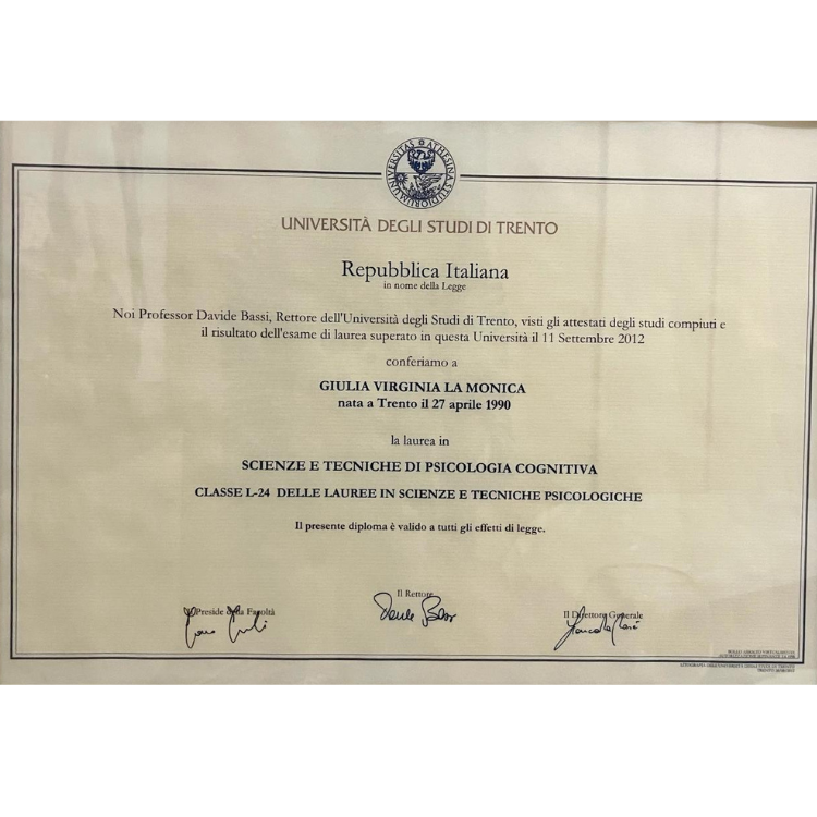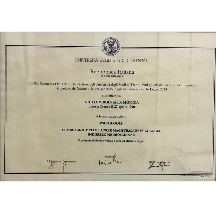 Con la Laurea in Neuroscienze (2014) ho potuto approfondire le funzionalità cognitive e le problematicità connesse all’ambito clinico appassionandomi al funzionamento del nostro cervello.